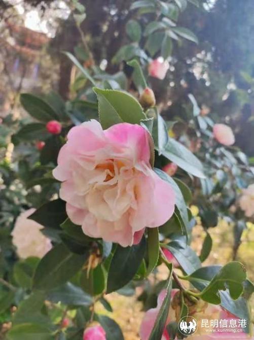 當(dāng)下已陸續(xù)開(kāi)花的山茶早花品種有“早牡丹”、“牡丹魁”、“菊瓣”、“早桃紅”、“雪嬌”、“粉通草”等,花期為12月底至1月間,觀賞地點(diǎn)集中于茶花園接待室片區(qū),太和宮及銅文化廣場(chǎng)。此外,園內(nèi)較多的傳統(tǒng)品種包括“朱砂紫袍”、“獅子頭”、“大理茶”、“松子麟”、瑪瑙”等,花期為1月中旬至2月中旬,觀賞地點(diǎn)為茶花園、太和宮及銅文化廣場(chǎng)。晚花品種包括“恨天高”、“童子面”等,花期為3月,觀賞地點(diǎn)位于茶花園。