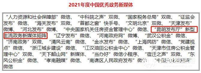 昆明信息港訊 12月31日,中國(guó)信息化研究與促進(jìn)網(wǎng)發(fā)布《2021年中國(guó)優(yōu)秀“互聯(lián)網(wǎng)+政法服務(wù)”平臺(tái)綜合影響力評(píng)估報(bào)告》(以下簡(jiǎn)稱(chēng)為《報(bào)告》)顯示,“昆明發(fā)布廳”新型主流政務(wù)新媒體矩陣在該項(xiàng)評(píng)估中獲評(píng)“2021年度中國(guó)優(yōu)秀政務(wù)新媒體”。這也是“昆明發(fā)布廳”自2015年以來(lái)第六次獲評(píng)為“中國(guó)優(yōu)秀政務(wù)新媒體”。