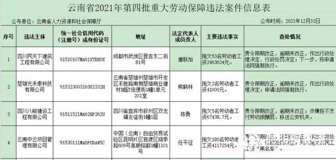 昆明信息港訊 記者江楓 近日,云南省人力資源和社會(huì)保障廳向社會(huì)公布2021年第四批重大勞動(dòng)保障違法案件。本次公布的案件共8件,涉及6個(gè)用人單位和2個(gè)自然人。