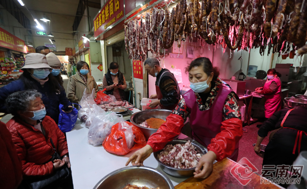 記者在銷售鮮肉的攤點了解到,雞肉和豬肉價格保持穩(wěn)定,眼下正是制作腌制品的時節(jié),市場中香腸加工的生意格外紅火,張瓊英大媽做了5公斤的滇味麻辣香腸,五花肉是33元/公斤,加工費是10元/公斤。