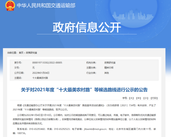 公示期為2022年1月4日至1月10日。公示期內(nèi),如對公示的候選路線有不同意見,可以通過電話、傳真、電子郵件、信函等形式向交通運輸部政策研究室反映情況(信函以到達日郵戳為準)。反映情況須客觀真實,以單位名義反映情況的材料需加蓋單位公章,以個人名義反映情況的材料應(yīng)署實名并提供有效聯(lián)系方式?! ?/p>