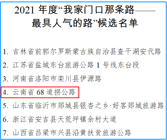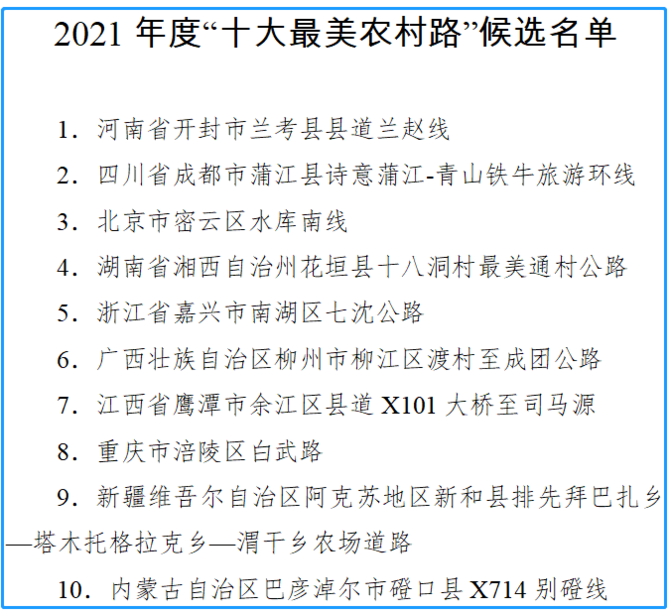 根據(jù)《交通運輸部辦公廳關(guān)于開展2021年度“十大最美農(nóng)村路”推選宣傳活動的通知》(交辦政研函〔2021〕734號)有關(guān)安排,產(chǎn)生了2021年度“十大最美農(nóng)村路”等候選路線,現(xiàn)予以公示。