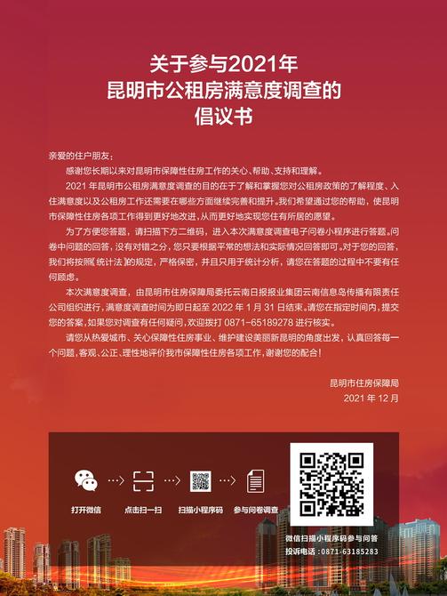 昆明市住房保障局相關(guān)負(fù)責(zé)人表示:“您的回答將得到嚴(yán)格的保密,并且只用于統(tǒng)計分析,請您在答題的過程中不要有任何顧慮,掃描下方倡議書上的二維碼,為昆明市保障性住房事業(yè)發(fā)展建言獻(xiàn)策,為建設(shè)美麗新昆明出一份力。”