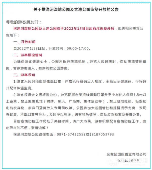 昆明信息港訊 記者楊雁 從度假區(qū)國(guó)投置業(yè)有限公司傳出消息:2022年1月8日起,撈漁河濕地公園及大漁公園將有序恢復(fù)開(kāi)放,請(qǐng)入園游客嚴(yán)格遵守疫情防控要求。
