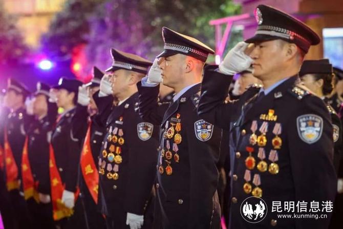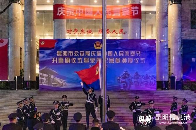 上午7時(shí)30分,昆明市公安局舉行升警旗儀式,全體民警齊唱《中國人民警察警歌》。民警以誓詞為號(hào)令,警旗為指引,面向中國人民警察警旗莊嚴(yán)宣誓。隨后,昆明市公安局舉行儀式,對(duì)立功受獎(jiǎng)的集體和個(gè)人代表進(jìn)行現(xiàn)場表彰并頒授獎(jiǎng)狀及獎(jiǎng)?wù)伦C書,為從警10年、20年、30年的民警輔警代表及近期光榮退休的民警輔警代表頒授紀(jì)念章。