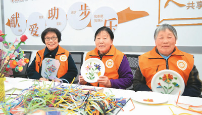 馬玉梅(左)等老年志愿者展示準(zhǔn)備捐獻(xiàn)的手工藝品。李樂攝