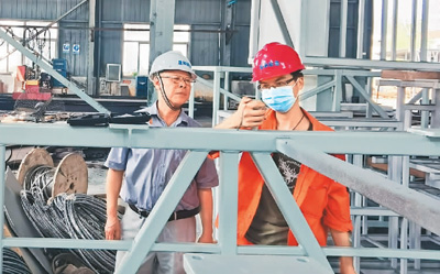 計(jì)萬(wàn)榮(左)指導(dǎo)年輕工人檢測(cè)橋梁施工設(shè)備。受訪者供圖