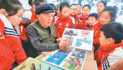 江蘇省連云港市海州區(qū)幸福社區(qū)的王佃寶護(hù)鳥多年,退休后更是把精力放在護(hù)鳥上。他經(jīng)常開車在海州灣畔巡視,清網(wǎng)救鳥,累計(jì)救助鳥類1000多只。圖為王佃寶深入學(xué)校向孩子們宣傳愛鳥護(hù)鳥的重要性。王健民攝(人民視覺)