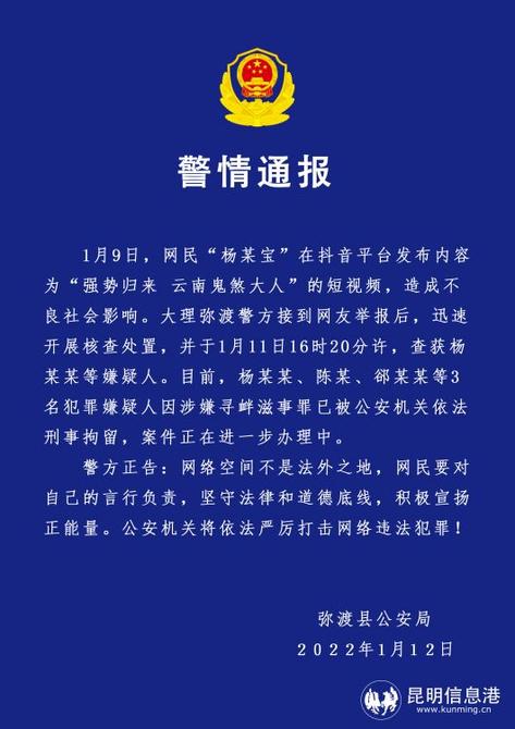 昆明信息港訊 記者合宇聰 記者從云南省公安廳獲悉,1月9日,網(wǎng)民“楊某寶”在抖音平臺(tái)發(fā)布內(nèi)容為“強(qiáng)勢歸來 云南鬼煞大人”的短視頻,造成不良社會(huì)影響。大理彌渡警方接到網(wǎng)友舉報(bào)后,迅速開展核查處置,并于1月11日下午4許,查獲楊某某等嫌疑人。