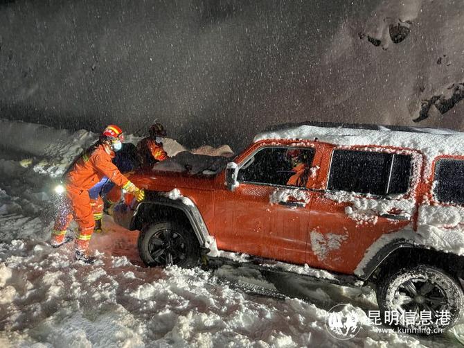 昆明信息港訊 記者勞學(xué)麗 通訊員謝進(jìn) 楊曉麗 1月12日,迪慶州德欽縣突降大雪,德貢公路孔雀山埡口2名麗江藥材商人及6名青海游客被困于公路積雪路段,情況不容樂觀,急需營救。接到報(bào)警后,德欽縣消防救援大隊(duì)迅速出動(dòng)1車6人前往救援。