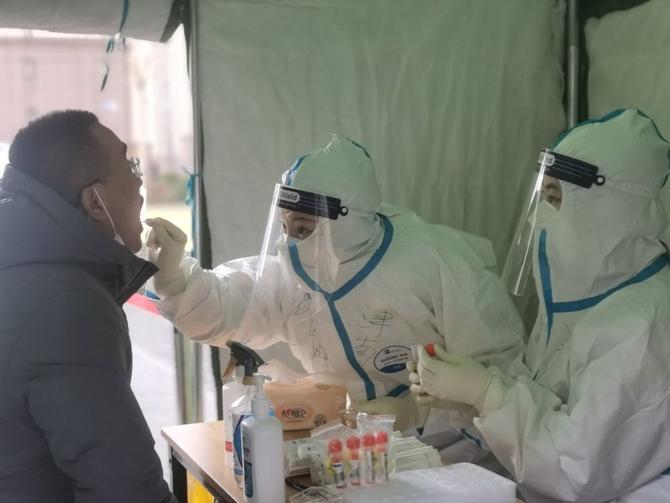 醫(yī)務(wù)工作者為天津市津南區(qū)雙林街象博豪庭社區(qū)(目前屬于防范區(qū))居民進(jìn)行第二輪核酸檢測。新華社記者 劉惟真 攝