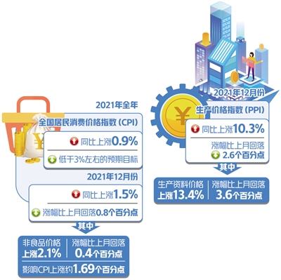 國家統(tǒng)計局1月12日發(fā)布數據,2021年全年,全國居民消費價格指數(CPI)前低后穩(wěn),比上年上漲0.9%,低于3%左右的預期目標,物價調控目標順利完成;工業(yè)生產者出廠價格指數(PPI)沖高回落,平均上漲8.1%。