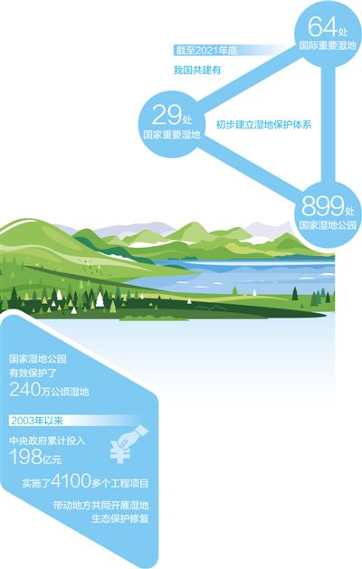 近年來,我國大力推進濕地保護修復(fù),先后出臺《關(guān)于加強濕地保護管理的通知》《濕地保護管理規(guī)定》《濕地保護修復(fù)制度方案》,28個省份出臺省級濕地保護法規(guī)或規(guī)章。截至2021年底,我國共建有64處國際重要濕地、29處國家重要濕地、899處國家濕地公園,初步建立濕地保護體系。但與此同時,隨著經(jīng)濟快速發(fā)展,保護和利用的矛盾日益凸顯?!皾竦卦馐芊欠ㄇ终肌鷫?、污染等現(xiàn)象時有發(fā)生,保護形勢依然嚴峻。”國家林業(yè)和草原局濕地管理司司長吳志民表示。