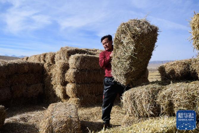 1月9日,在青海省海北藏族自治州門源回族自治縣皇城蒙古族鄉(xiāng)馬營村,牧民準備牧草喂羊。新華社記者 張龍 攝