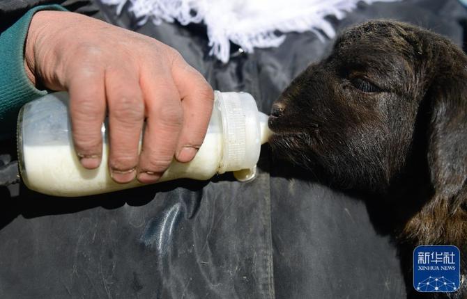 1月10日,在青海省海北藏族自治州門源回族自治縣皇城蒙古族鄉(xiāng)馬營村,牧民給羊羔喂奶。新華社記者 張龍 攝