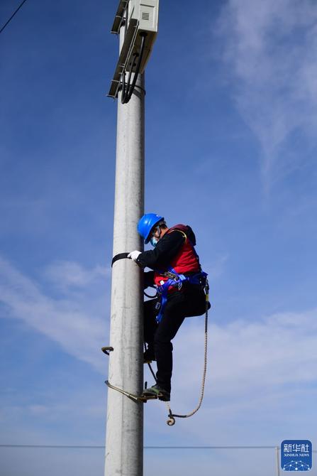 屋外,國網(wǎng)青海電力公司共產(chǎn)黨員服務(wù)隊的李文科穿戴好腳扣,爬上電線桿,檢查配電箱里導線連接情況。