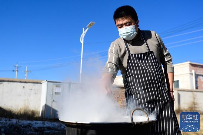 1月10日,在青海省海北藏族自治州門源回族自治縣皇城蒙古族鄉(xiāng)政府大院,工作人員煮粥準備派發(fā)給群眾。新華社記者 張龍 攝