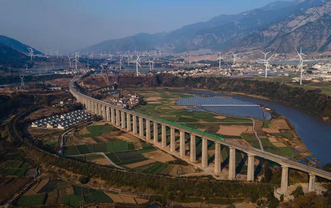 復(fù)興號滿載盛裝乘客,以時(shí)速160公里一路向南,掠過山間河谷。只見從前的荒涼山脊如今遍布著風(fēng)電機(jī)組,陡峭山腰嵌起了銀色線條,那是一條條通村公路。沿途一處處鎮(zhèn)村,一棟棟居民新樓,掩映于樹下、花前、塘邊……
