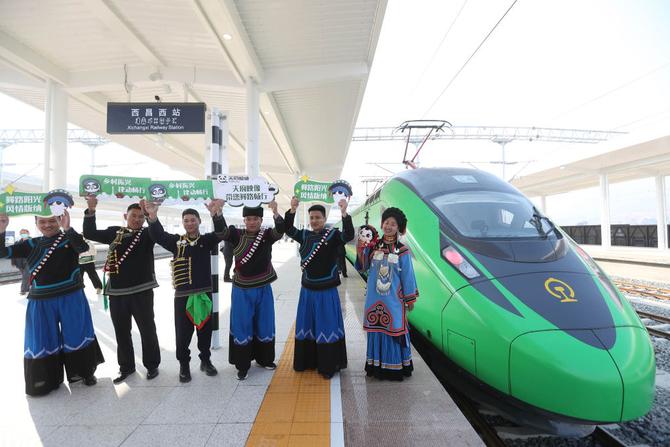 1月10日,在西昌西站,身著彝族服飾的大涼山群眾在復(fù)興號D843次列車前留影。新華社記者 江宏景 攝