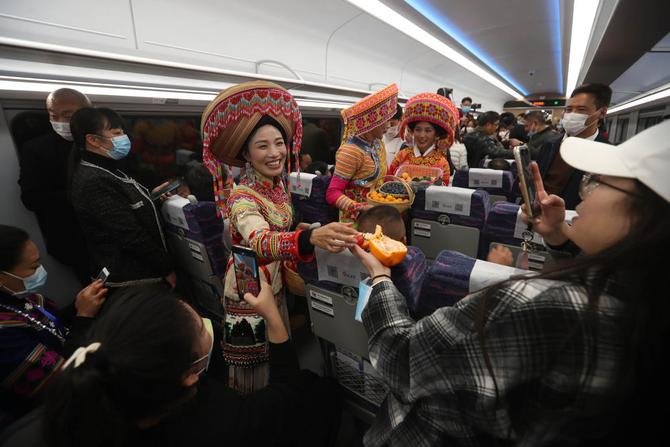 1月10日,在復(fù)興號D843次列車上,德昌縣傈僳族婦女安娜媤維(著民族服飾者左一)向乘客贈(zèng)送當(dāng)?shù)氐乃P氯A社記者 江宏景 攝
