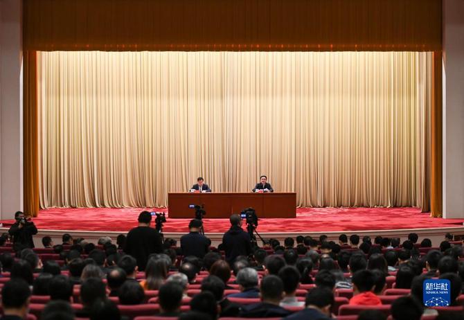 2021年3月16日,黨史學習教育中央宣講團首場報告會在北京舉行。這是中央宣講團成員、中央黨史和文獻研究院院長曲青山(右)在報告會上作宣講報告。新華社記者 陳曄華 攝