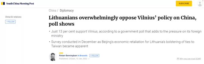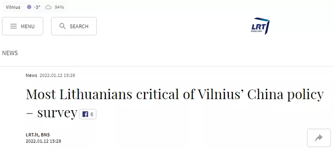 報(bào)道介紹,立陶宛這份民調(diào)于2021年12月10日至18日進(jìn)行,詢問(wèn)問(wèn)題包括該國(guó)民眾如何看待當(dāng)前立陶宛對(duì)華政策。周二(1月11日)公布的結(jié)果顯示,僅13%的受訪者表示支持,有60%的人持否定態(tài)度。