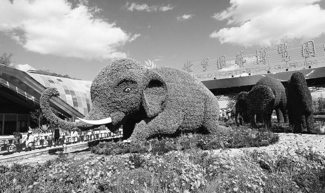 世博園打造的“象往世博”亞洲象迎賓主題綠雕景觀 本報記者 楊崢 攝