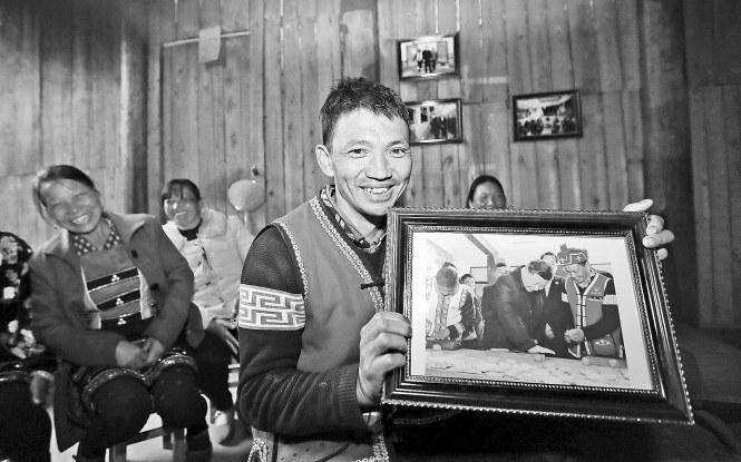 騰沖市司莫拉佤族村村民李發(fā)順珍藏的與習(xí)近平總書記的合影照 本報(bào)記者 楊崢 攝
