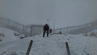 執(zhí)勤人員迎著風(fēng)雪站