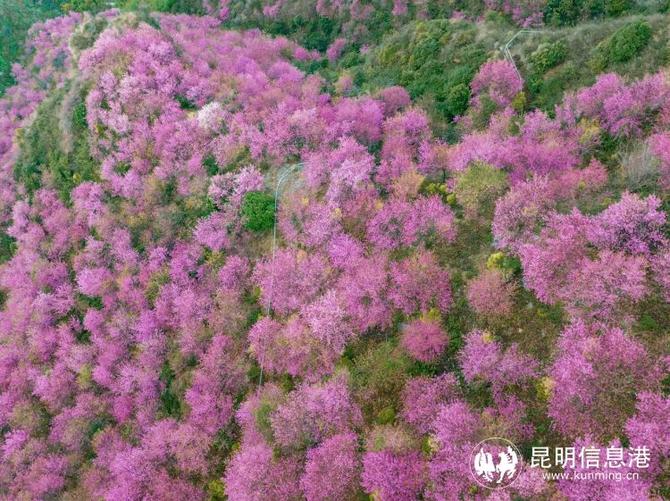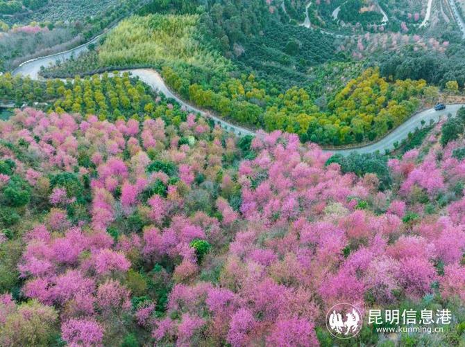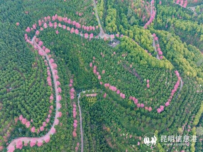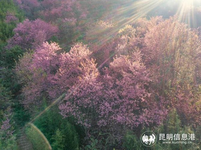 昆明信息港訊 記者段佳琪 通訊員楊小明 近日,走進位于昆明市宜良縣狗街鎮(zhèn)玉龍村東南玉龍山的冬林苑,成片粉色櫻花綻放,與蜿蜒的步道、古香古色的古寺交相輝映,勾勒出一幅古雅清秀的山中冬景圖,美不勝收。