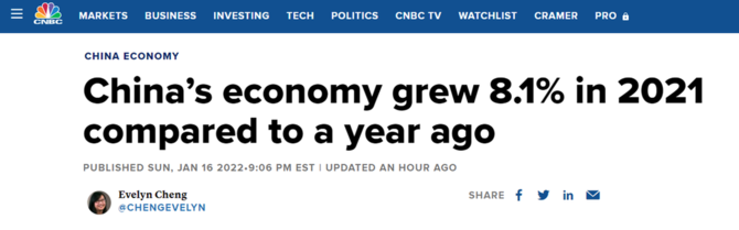 美國CNBC網站1月17日報道稱,中國國家統(tǒng)計局發(fā)布的數據顯示,初步核算,2021全年國內生產總值1143670億元,按不變價格計算,比上年增長8.1%。