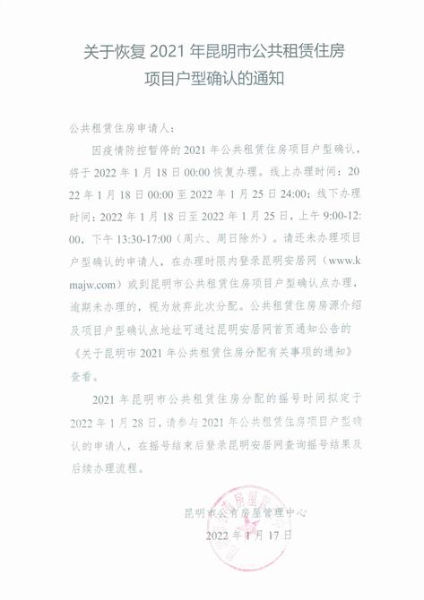 昆明信息港訊 記者上官艷君 1月17日,昆明市公有房屋管理中心發(fā)布關(guān)于恢復(fù)2021年昆明市公共租賃住房項(xiàng)目戶型確認(rèn)的通知。