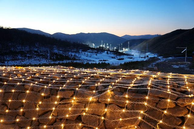 這是2021年12月30日拍攝的崇禮長(zhǎng)城景觀展示亮化工程現(xiàn)場(chǎng),遠(yuǎn)處為國(guó)家越野滑雪中心。新華社記者 牟宇攝