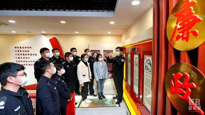 △2021年11月,江蘇南京港出入境邊防檢查站民警參觀廉政警示教育展廳。(圖/視覺中國)