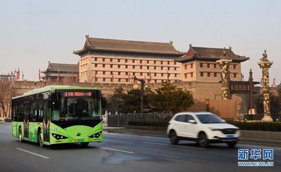 1月18日,公交車行駛在西安市永寧門外的道路上。新華社記者 陶明/攝