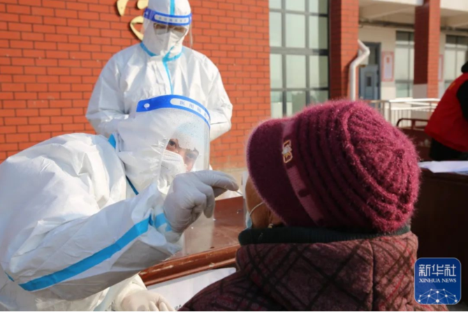 1月15日,濮陽市范縣開展全員核酸檢測工作。圖為范縣辛莊鎮(zhèn)核酸檢測點(diǎn)醫(yī)務(wù)人員正在進(jìn)行核酸采樣。(付邦欽 攝)