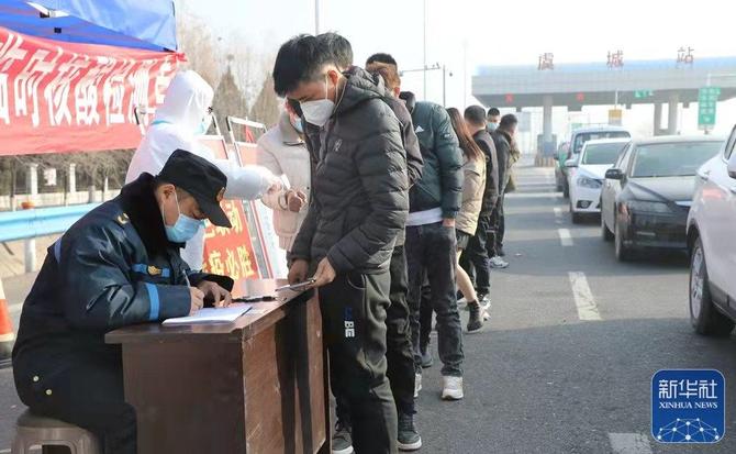 1月13日,商丘市虞城縣開展第二輪全員核酸檢測。圖為虞城劉店高速收費(fèi)站出站口,返鄉(xiāng)人員在進(jìn)行信息登記,隨后將接受核酸檢測。(周謙攝)