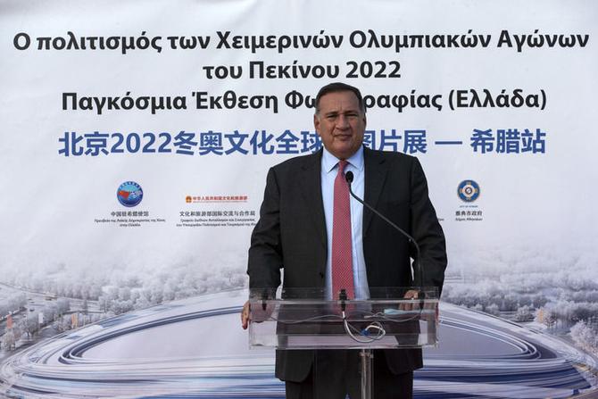 資料圖:2021年10月13日,希臘奧委會(huì)主席卡普拉洛斯在北京2022冬奧文化全球行圖片展開(kāi)幕儀式上。新華社發(fā)(馬里奧斯·羅洛斯攝)