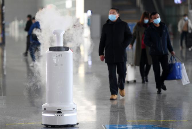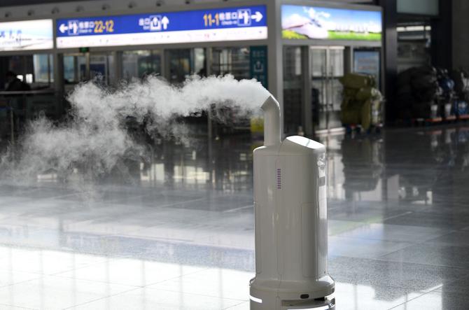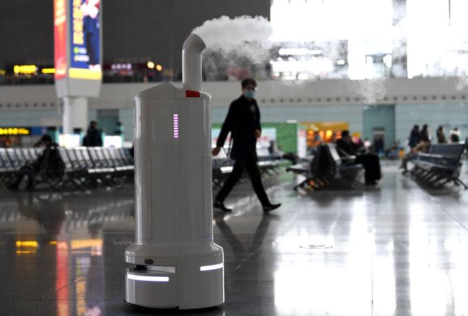↑1月18日,空氣環(huán)境自動消毒機器人“小創(chuàng)”在合肥南站通過自動識別路徑進行噴灑消毒。