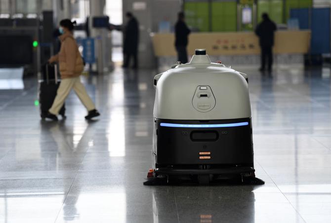 ↑1月18日,地面清掃消毒機器人“小德”在合肥南站進行地面清掃消毒。
