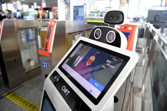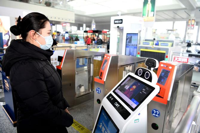 ↑1月18日,智能防疫測溫機器人“大白”在合肥南站進站口為旅客測溫。