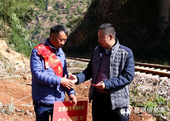 昆明信息港訊 記者上官艷君 通訊員王永文 陳暢 呂蒙 “我只是打了一個(gè)電話,想不到還沒到春節(jié)就收到了鐵路部門給我的獎(jiǎng)勵(lì),提前感受到了年味兒?!?月19日,昆明市東川區(qū)阿旺鎮(zhèn)安樂村委會磨碑組村民林祖云,從云南省鐵路護(hù)路護(hù)路聯(lián)防辦公室工作人員手中,接過一面寫有“平安鐵路共創(chuàng)建 護(hù)路公民獻(xiàn)真情”的表彰錦旗和2000元的獎(jiǎng)勵(lì)大紅包,淳樸的面龐上流露出喜悅的笑容。