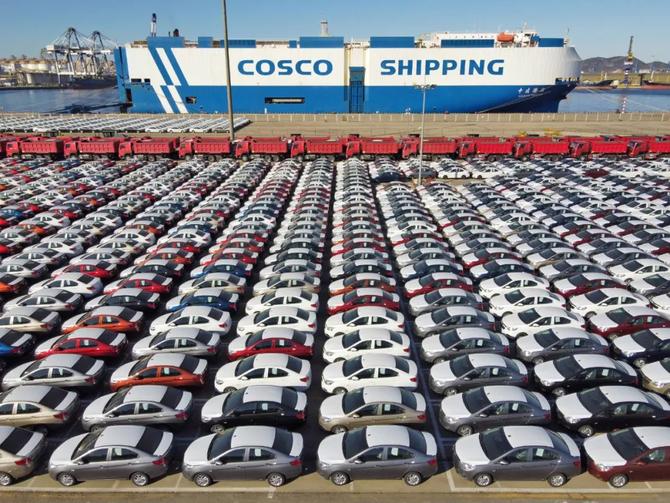 大批出口商品車(chē)在山東港口煙臺(tái)港集結(jié)等待裝船(2021年12月7日攝,無(wú)人機(jī)照片)。新華社發(fā)(唐克 攝)
