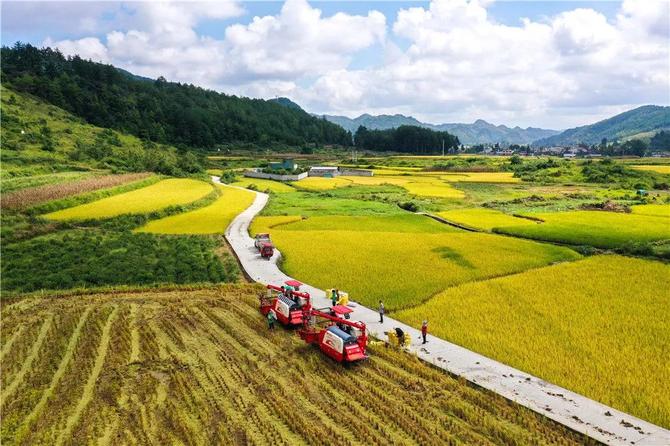 2021年9月15日,貴州省龍里縣灣灘河鎮(zhèn)羊場(chǎng)社區(qū)的農(nóng)民在搶收稻谷(無(wú)人機(jī)照片)。新華社記者楊文斌 攝
