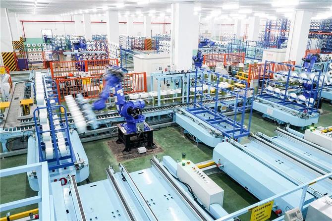 在位于江蘇省蘇州市吳江區(qū)盛澤鎮(zhèn)的一家智能車(chē)間,機(jī)器人在車(chē)間內(nèi)自動(dòng)作業(yè)(2021年5月14日攝)。新華社記者 李博 攝