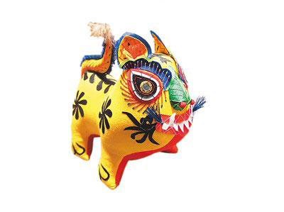 山西吉祥虎枕(也可作為玩具),為意象化的猛虎造型。其造型元素與民間虎頭鞋、虎頭帽樣式如出一轍。虎呈站立姿態(tài),鼻子造型中融入了艾草葉造型。民間觀念中,老虎是百獸之王,人們常用艾草制成老虎的形狀來驅除疾病,而艾草本身也可治百病,相當于百草之王?;⒀?、虎牙、虎耳、虎尾皆用拼裝化構件組合而成,身軀上亦分布有花型毛旋,形成吉祥喜慶的裝飾風格,與年畫之虎相比多了一份稚拙與可愛。布虎多是母親為孩子所做,體現(xiàn)了中國婦女的心靈手巧和聰明才智。一針針、一線線的縫制,都融入了滿腔的愛意。