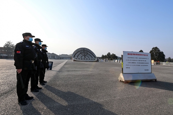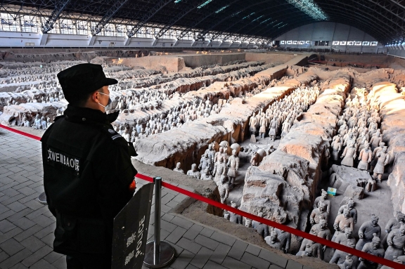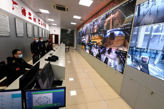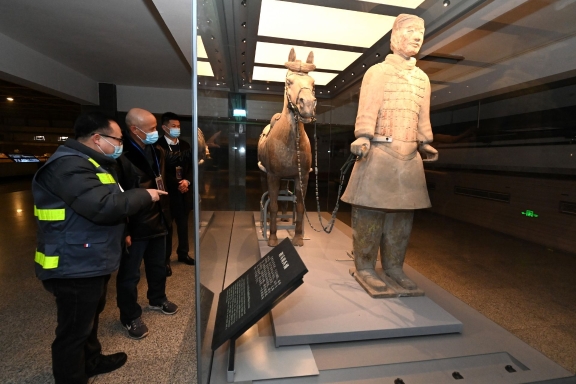 1月19日,秦始皇帝陵博物院值守人員巡查展館內(nèi)兵馬俑安全狀況。受疫情影響該院目前是閉館狀態(tài),但值守人員絲毫沒有松懈,各司其職地守護國寶。截至2021年年底,該院實現(xiàn)了第34個文物安全年。