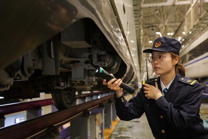 每列高鐵動(dòng)車都配備一名隨車機(jī)械師。出庫(kù)前,機(jī)械師要仔細(xì)檢查動(dòng)車底、裙板、蓋板是否鎖閉到位,車輪踏面有無(wú)剝離擦傷等近百個(gè)作業(yè)項(xiàng)目。幾乎每隔幾秒鐘,機(jī)械師就要完成一次蹲起動(dòng)作;每檢查一個(gè)作業(yè)項(xiàng)點(diǎn),她們就要進(jìn)行拍照攝像,并用攝像手電錄下口述的檢查項(xiàng)點(diǎn)和技術(shù)要求。