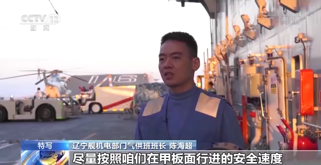 遼寧艦機電部門氣供班班長 陳海超:盡量按照咱們在甲板行進的安全速度,也不能太快,尤其是咱們在進行推車作業(yè)的時候,一定要避開甲板調(diào)度的引導(dǎo)員還有一些危險區(qū)域,包括咱們殲-15的起落架,尾噴(口)、進氣道這些部位,基本上都要按照指定的路線進行補給。