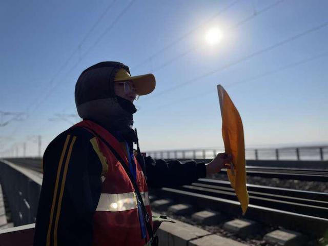 每當(dāng)列車(chē)經(jīng)過(guò)前,防護(hù)員符碩予便會(huì)接到駐站聯(lián)絡(luò)員打來(lái)的電話,他用對(duì)講機(jī)通知工友“下行車(chē)輛進(jìn)入現(xiàn)場(chǎng),注意避讓”,隨后他吹響喇叭、舉起黃旗提示車(chē)輛慢行,大家躲進(jìn)避車(chē)臺(tái)避車(chē)。為了方便接打電話,盡管天氣嚴(yán)寒,符碩予也不喜歡戴手套,手被凍得腫脹。